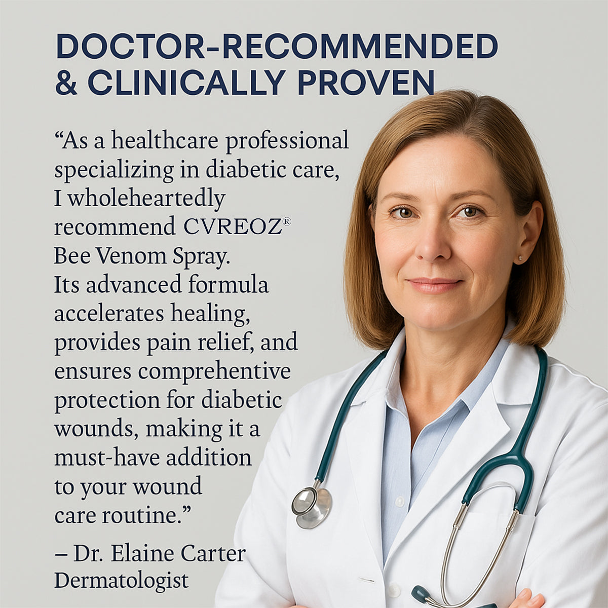 âAs a healthcare professional specializing in diabetic care, I wholeheartedly recommend CVREOZÂź VenHeal Bee Venom Spray. Its advanced formula accelerates healing, provides pain relief, and ensures comprehensive protection for diabetic wounds, making it a must-have addition to your wound care routine.â