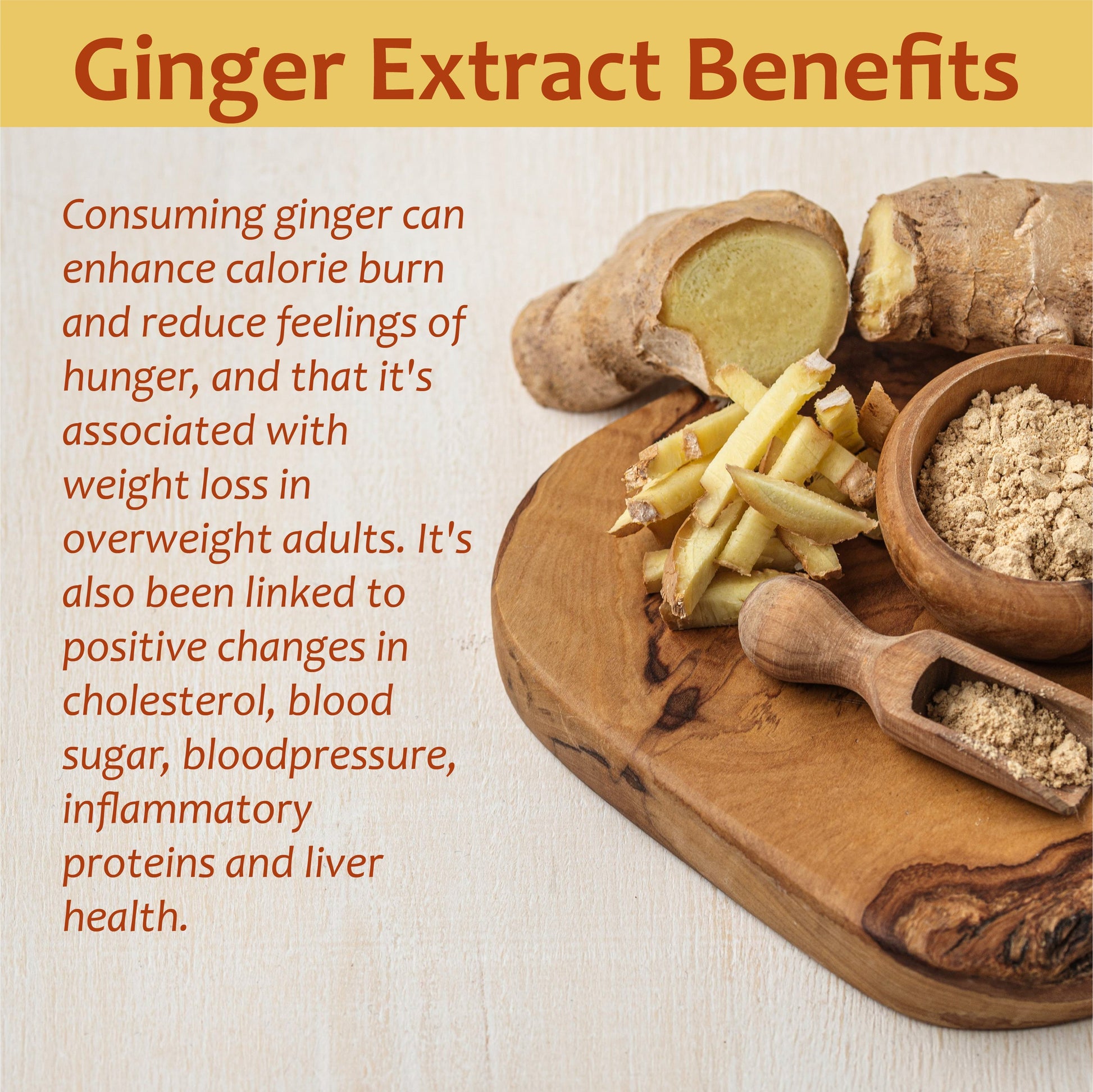 Ginger Extract: Boosting metabolism and promoting thermogenesis, ginger extract enhances calorie burning and supports weight loss efforts, while its anti-inflammatory properties aid digestion and reduce bloating.